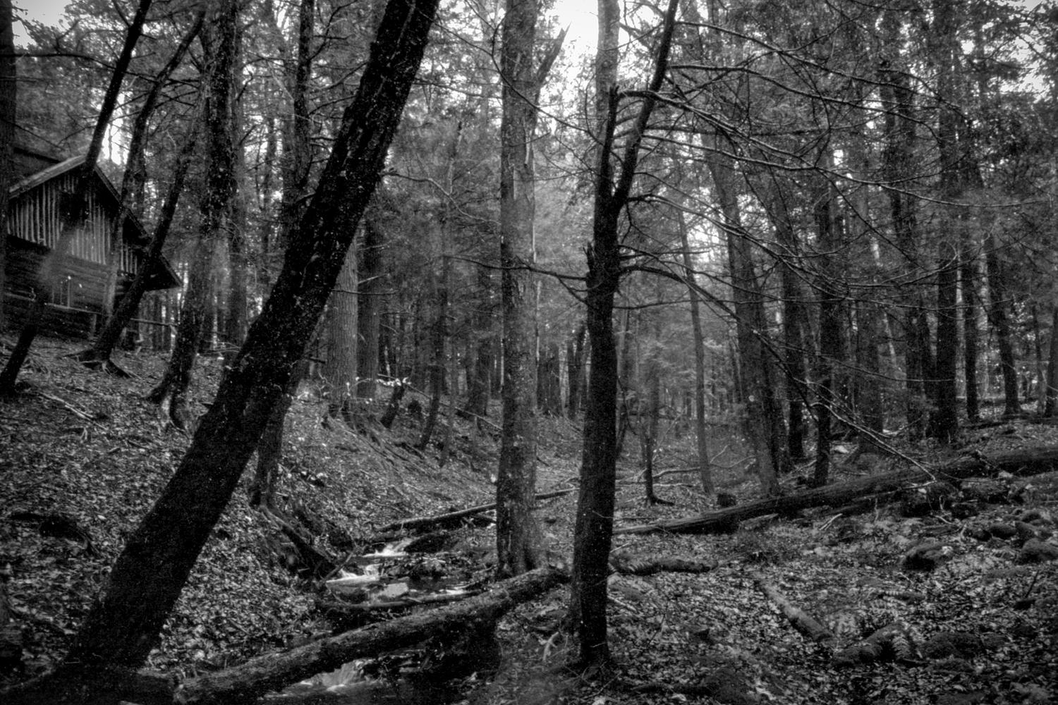 Black and white image of a quiet cabin in the woods looking over a stream.